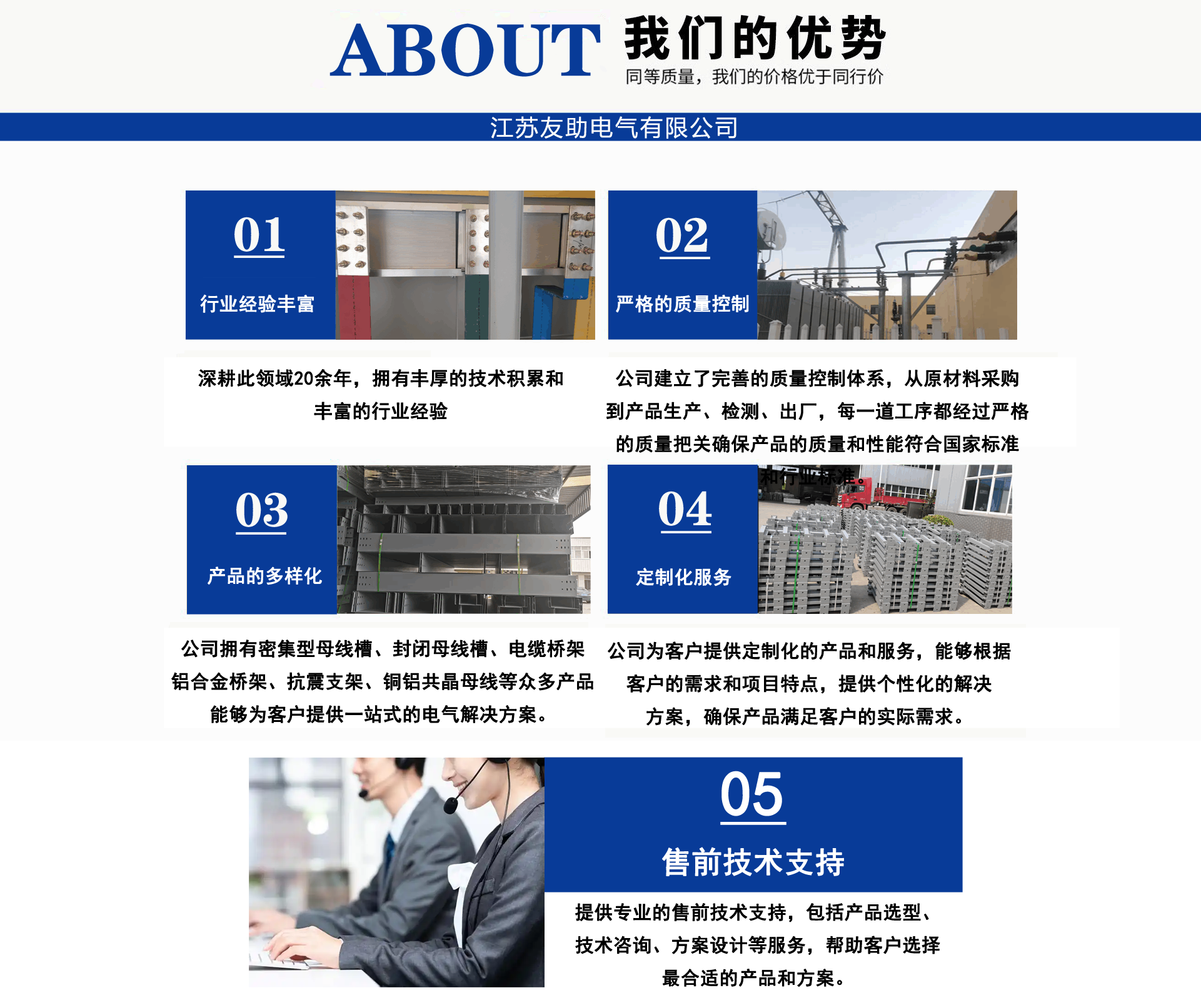 江蘇友助電氣有限公司地處中國工程電氣生產基地-一江蘇省揚中市。經營范圍:電纜橋架,母線槽(橋),管型母線,銅軟連接(伸縮節),高低壓開關柜,配電箱,抗震支架產品系列?!」咀谥迹嚎蛻糁辽?。已成功為江蘇二十屆省運會會場-泰州體育館,南京寶龍商業綜合體,張家口百兆瓦風電場,濟源市婦幼醫院,威海市未來科技園,湖北皇恩燁新材料科技有限公司,南京中央路小學,南通中天大酒店,新疆新安特鋼有限公司,河北省送變電有限公司,南京南微醫學研發基地等多項工程配套服務,我們愿與您精誠合作,互利共贏!公司技術人員深耕橋架,母線領域30年,為您提供橋架,母線槽疑難問題解決方案。母線槽不論每相是單排,雙排,三根排重疊,不管有多少個水平彎、垂直彎,轉接排在發貨前預裝一遍,確保尺寸無誤。到現場直接擰螺絲,效率高,橫平豎直,規規矩矩,符合標準,供電局,業主,監理,驗收易通過。供貨周期3-7天。為了讓尊貴客戶您,設備安全通電,高枕無憂。我們提供如下售前售中售后服務: 售前:免費技術支持,咨詢?!∈壑?免費現場精確測繪、設計。 售后:安裝服務,免費指導。 質量是生命,客戶是源泉。承諾客戶的,一定全力做到。讓我們一起進步!...